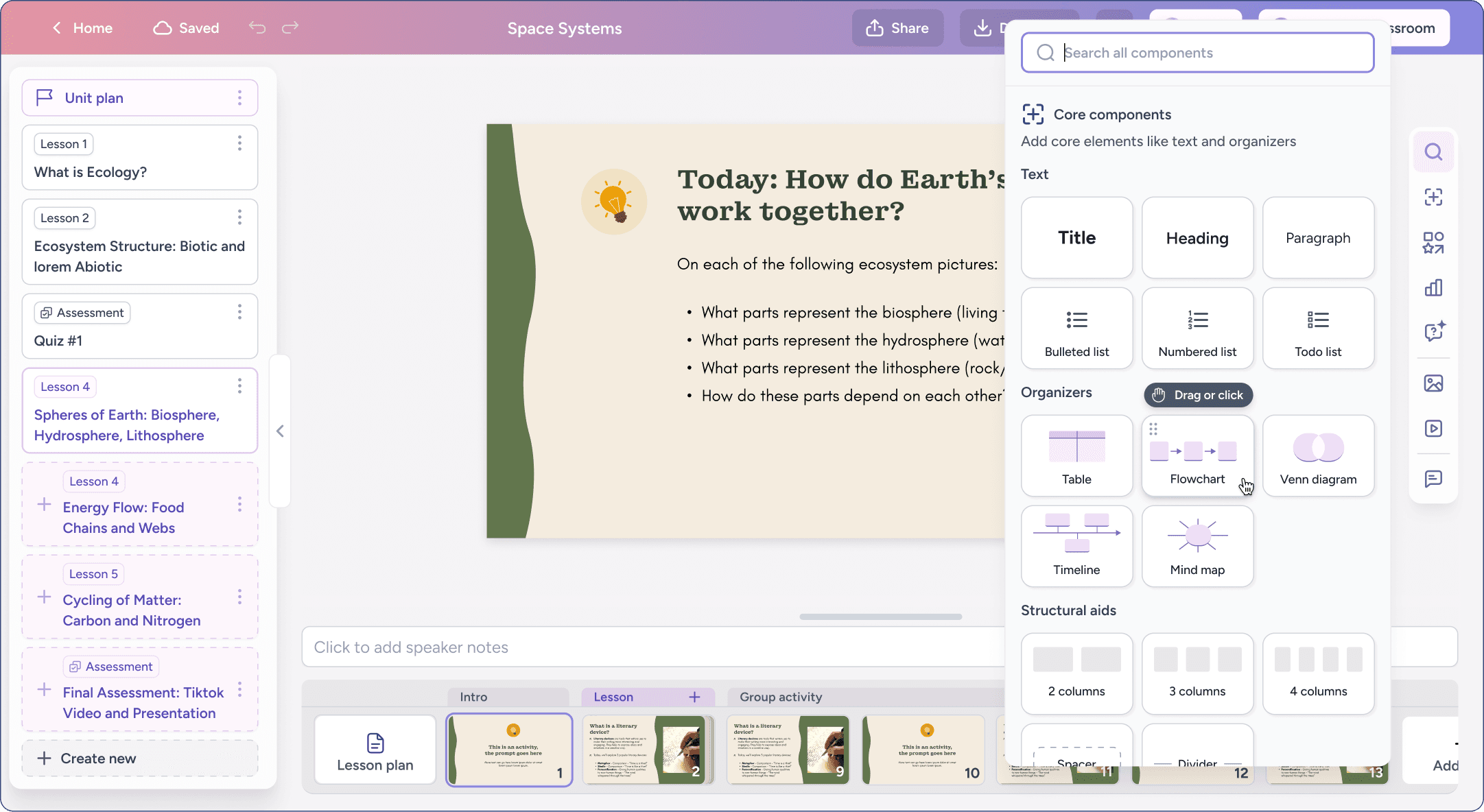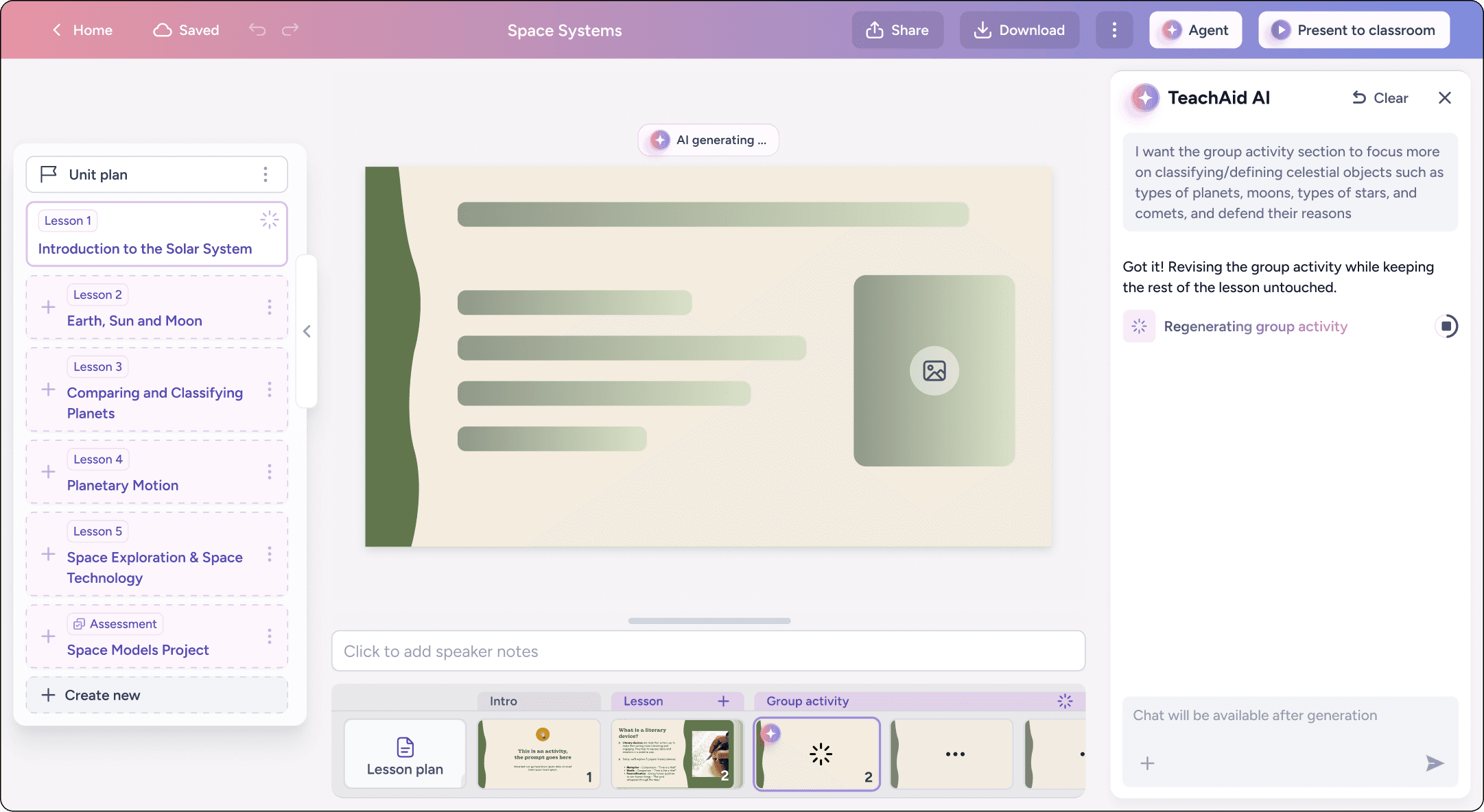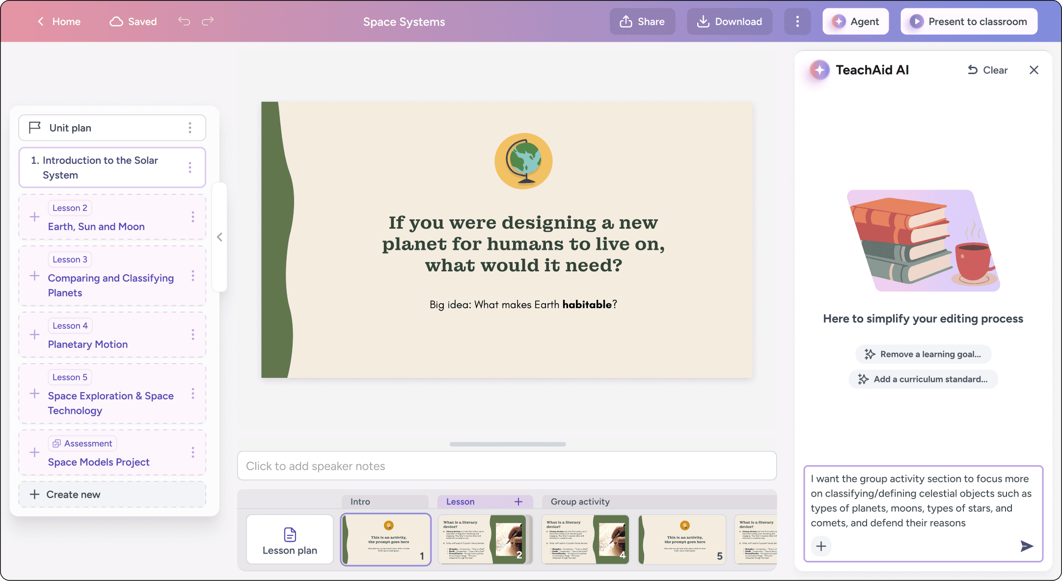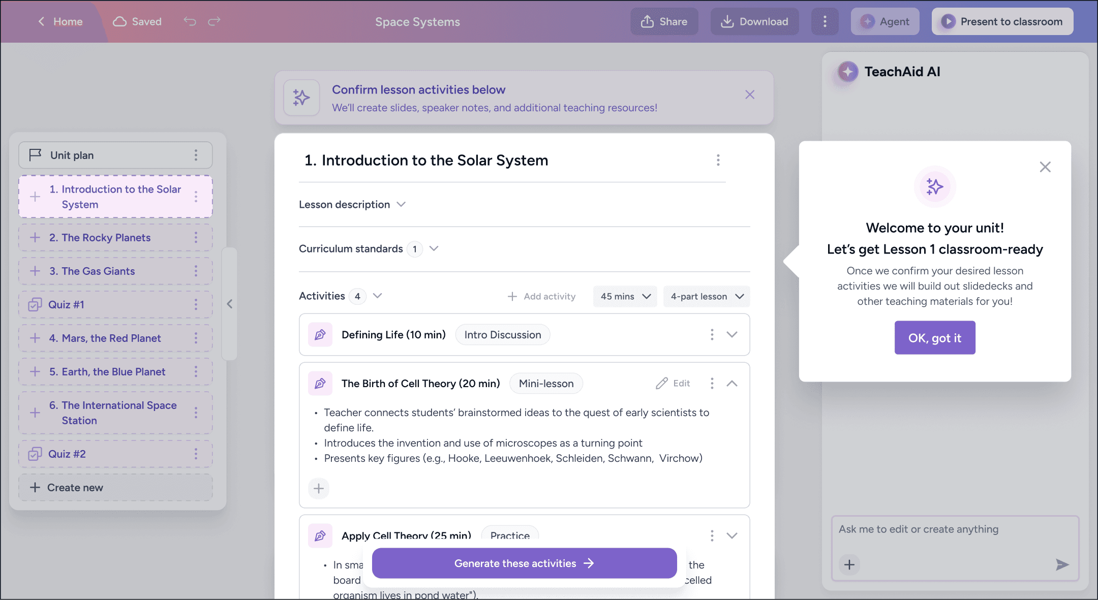 As a result, units function as living artifacts that evolve over time. Teachers can explore ideas, make conceptual shifts within a lesson, and fine-tune individual slides and worksheets at any moment.