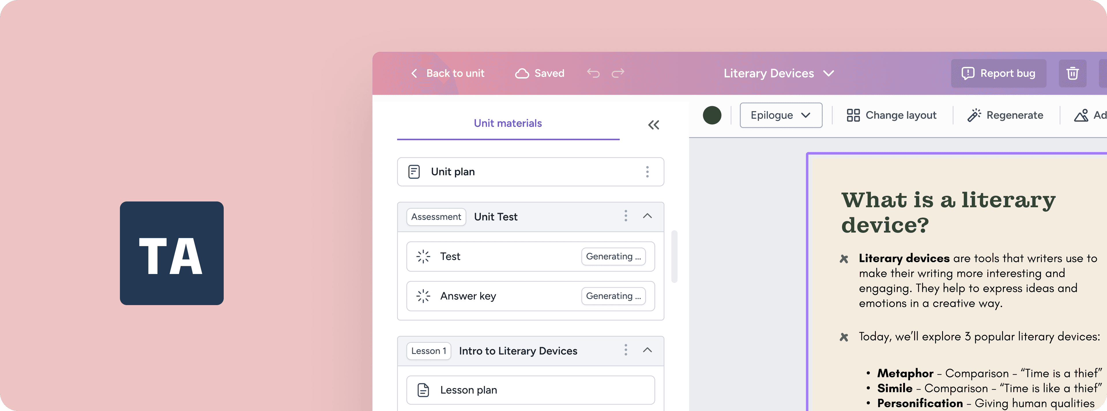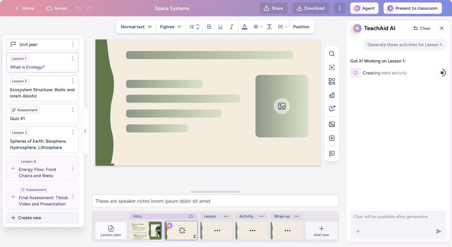 TeachAid focuses on helping teachers quickly translate ideas into cohesive, classroom-ready materials. While other AI tools often provide only one 'piece of the puzzle', we generate full units comprising of lesson plans, slides, worksheets, and assessments.